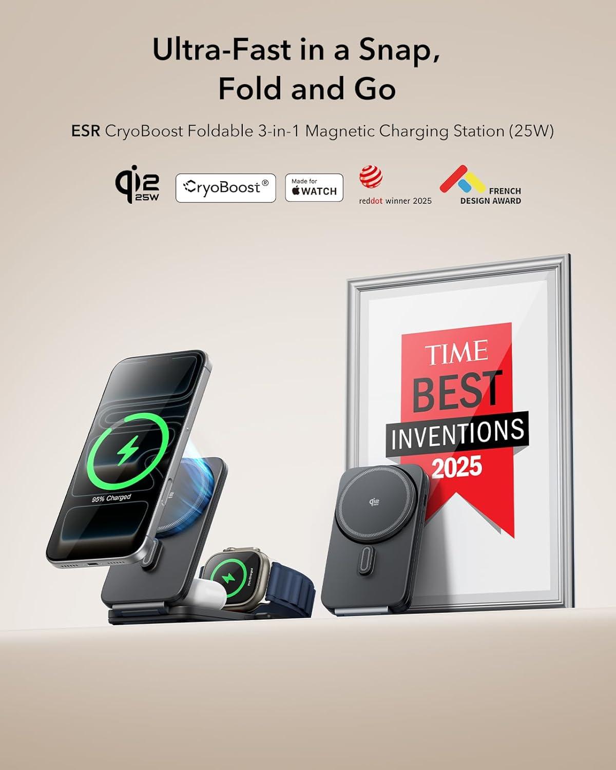 ESR 3 in 1 Charging Station for Apple, Qi2.2 25W MagSafe Charger with CryoBoost, Phone-Cooling Wireless Charging Station Foldable, for iPhone 17/16 with iOS 26(50W Adapter), AirPods, Apple Watch,Black(Black)