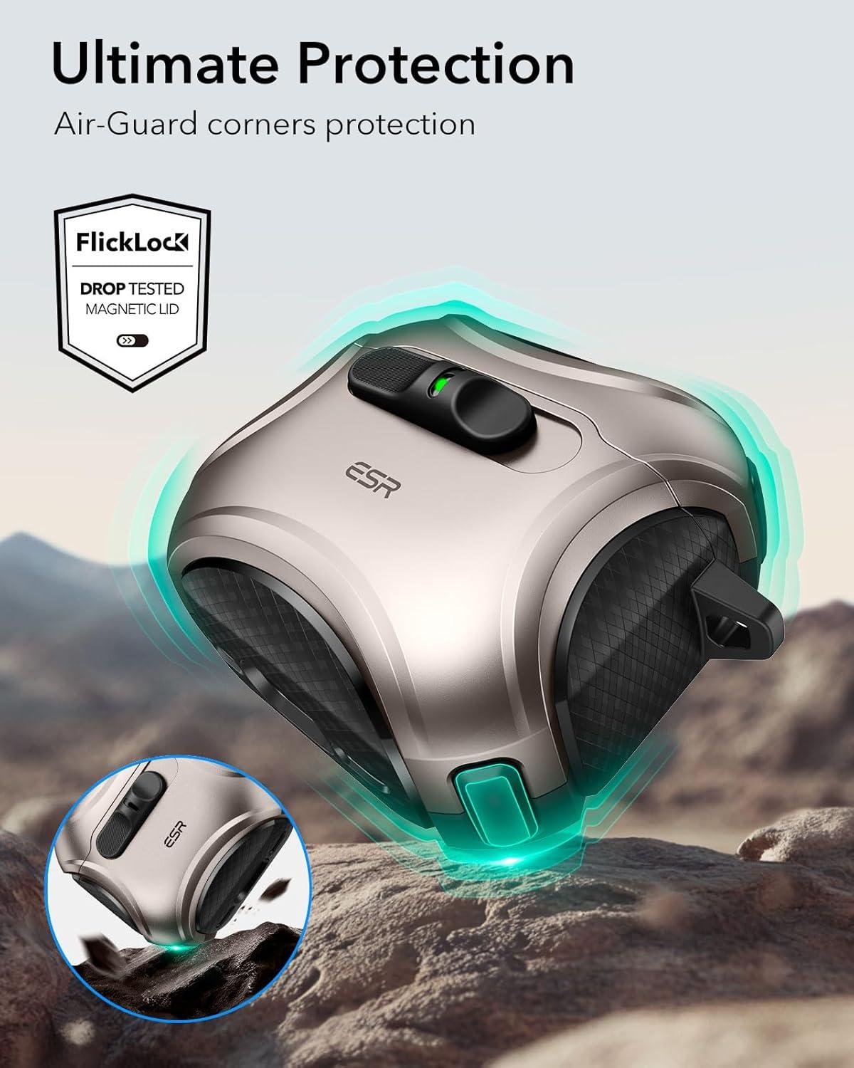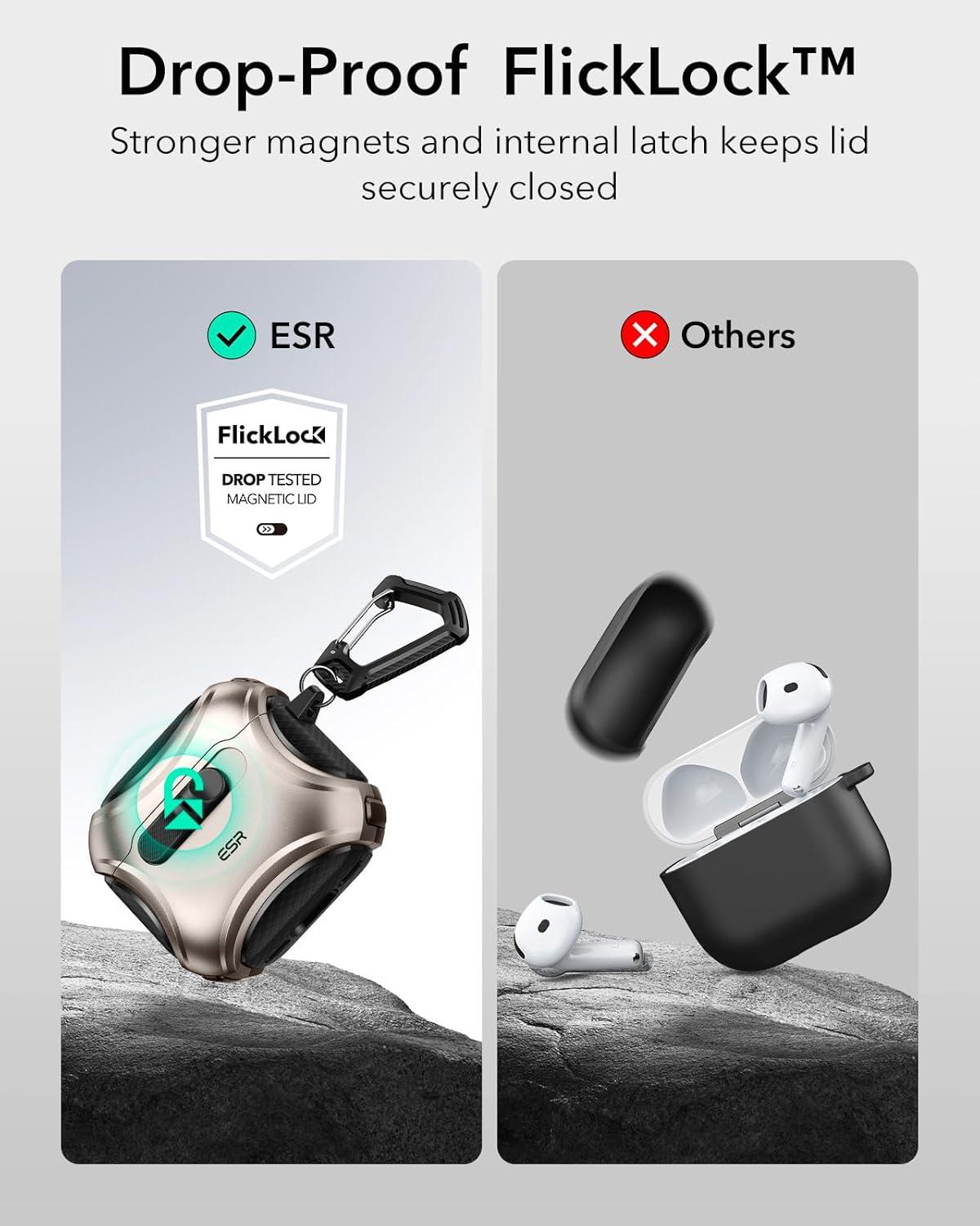 Secure FlickLock: strong magnets with 700 g of holding force in the top and bottom of the lid and an internal latch keep your AirPods locked safely inside so they won’t pop out if dropped