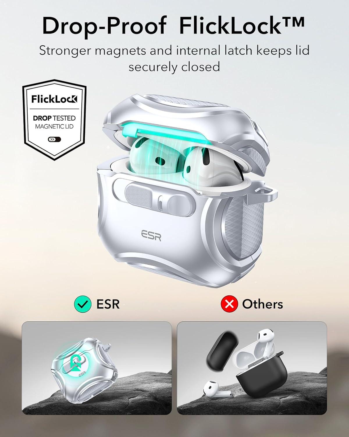 Secure FlickLock: strong magnets with a holding force of 750g in the top and bottom of the lid, and an internal latch keep your AirPods locked safely inside so they won’t pop out if dropped
