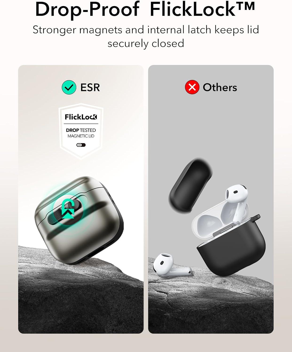 Drop-Proof Lid Lock: strong magnets with 700 g of holding force in the top and bottom of the lid and an internal latch keep your AirPods locked safely inside so they won’t pop out if dropped