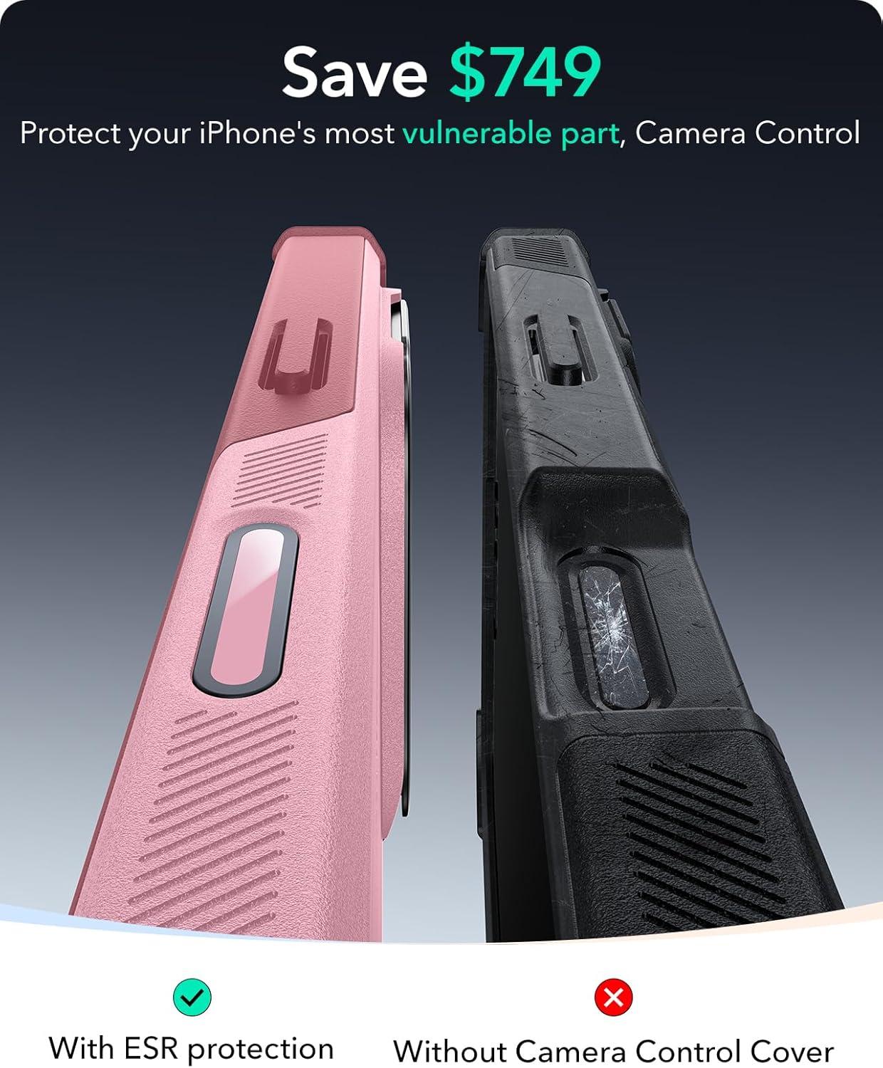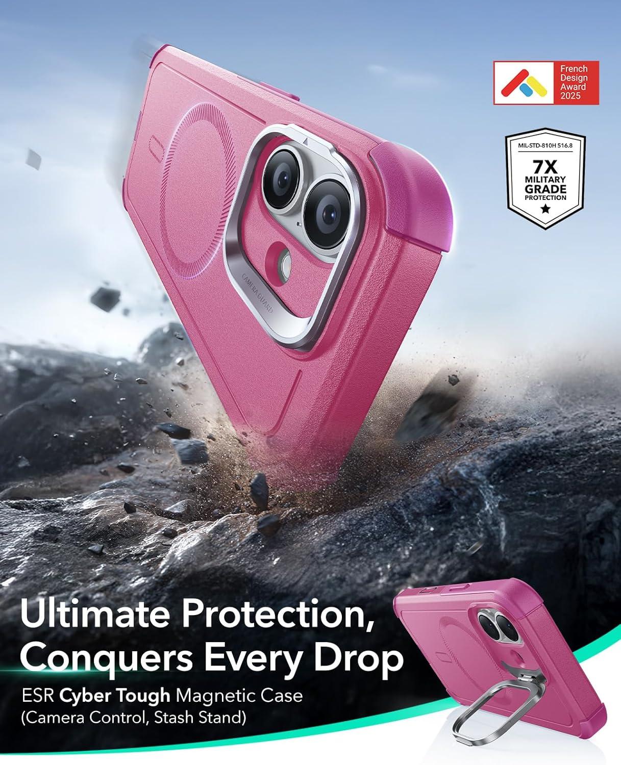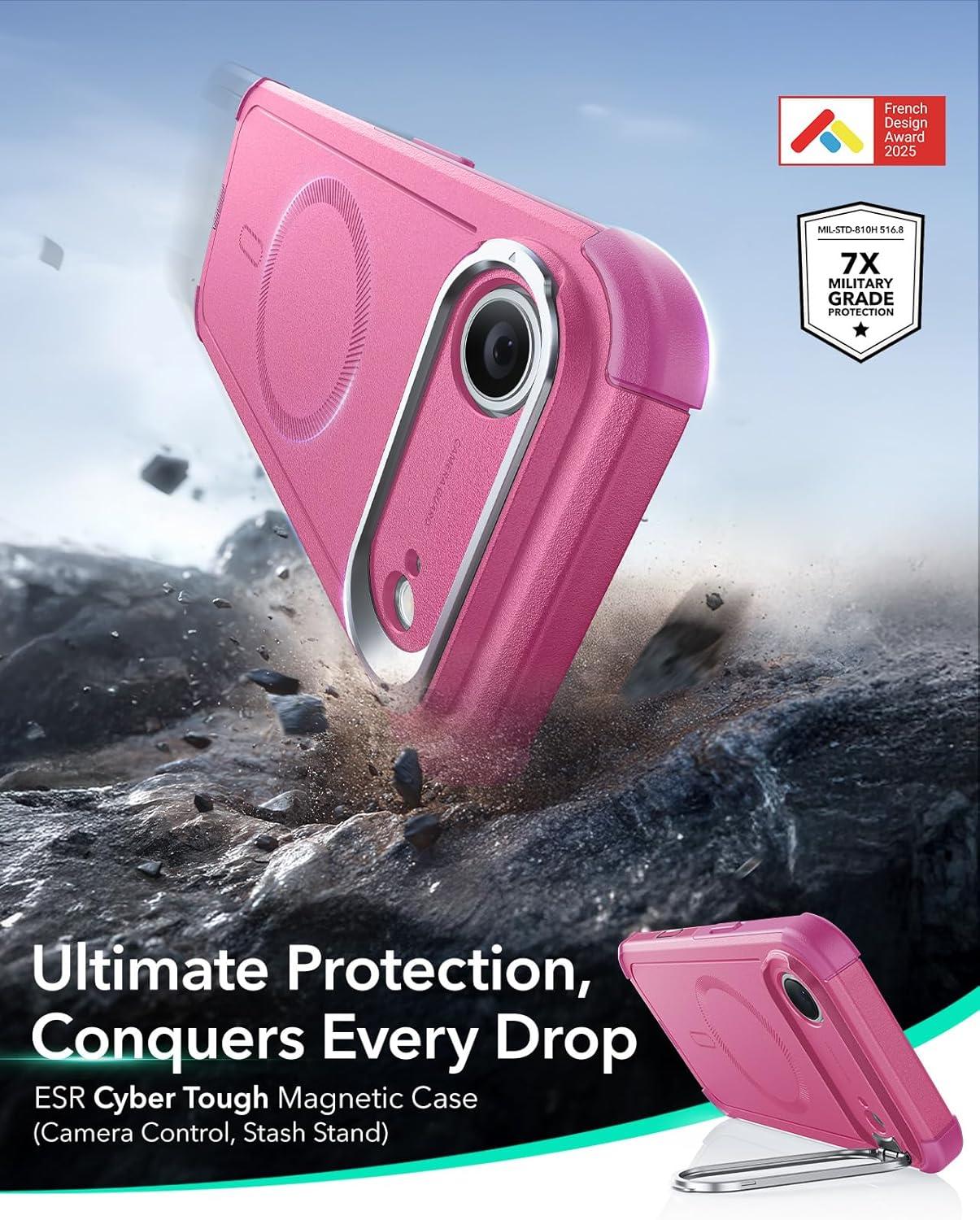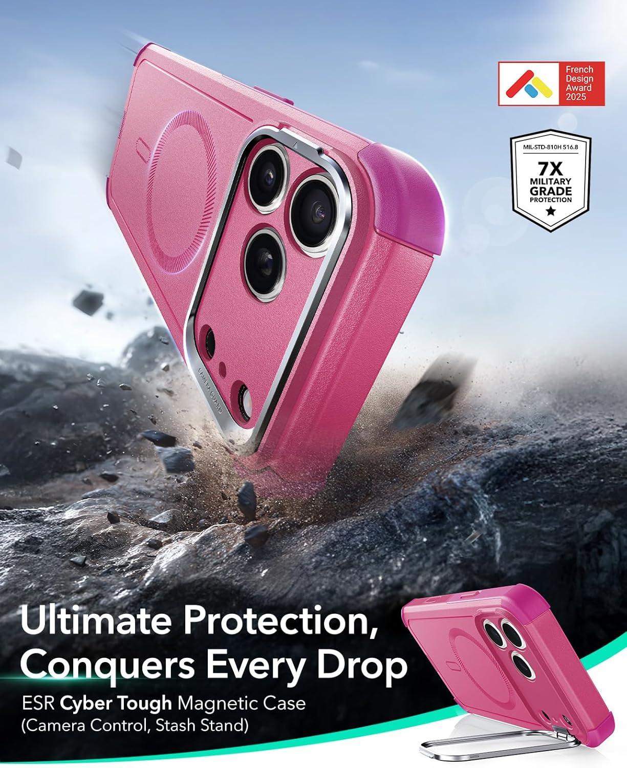ESR for iPhone 13 Pro Case with Stand, 23 ft Military-Grade Drop Protection Heavy Duty Magnetic Phone Case, Compatible with MagSafe Accessories, Cyber Series, Black(A-Camera Control-Pink)