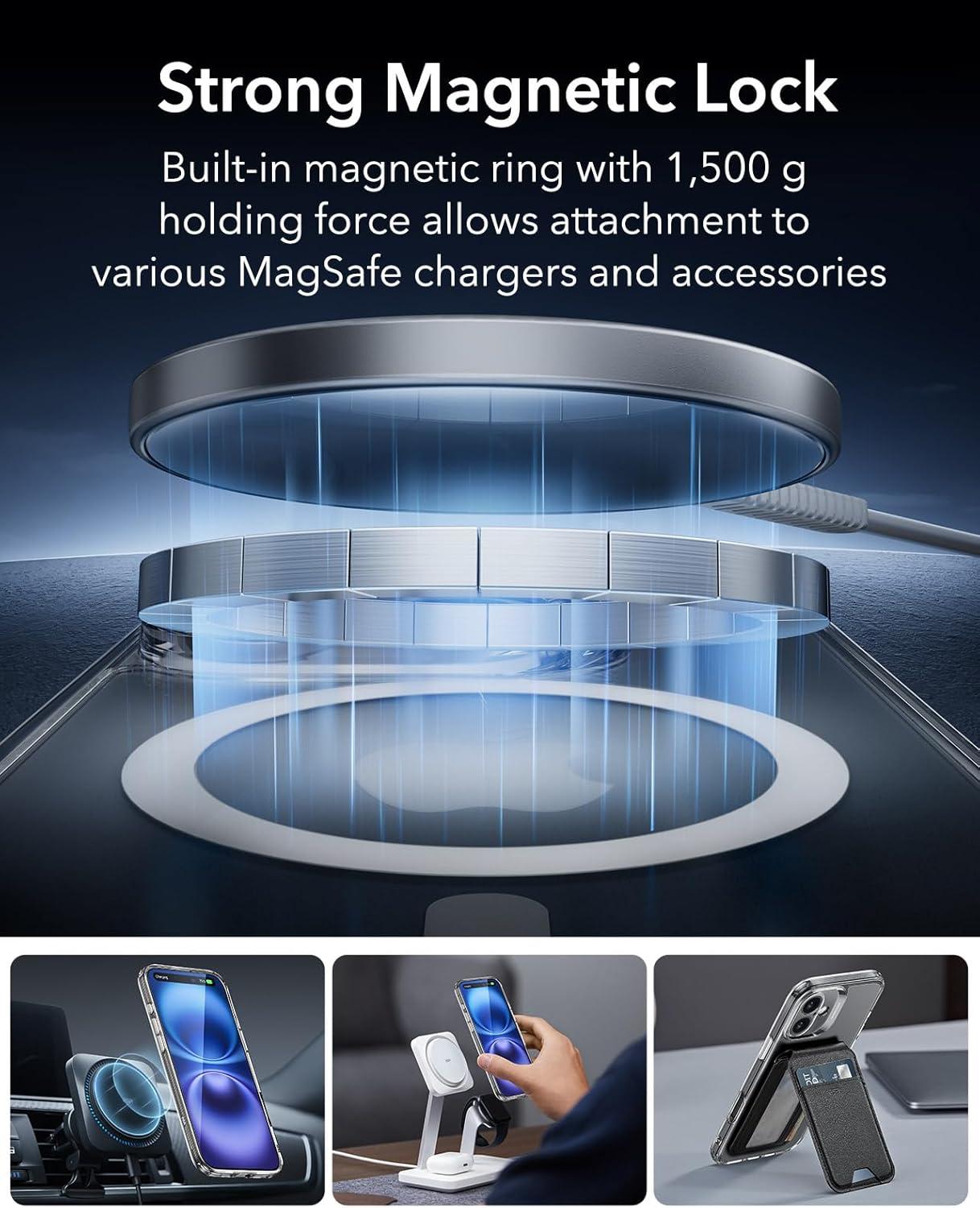 Stronger Magnetic Lock: powerful ring of magnets with 1,500 g of holding force enables faster, easier place-and-go wireless charging and a secure lock on any MagSafe accessory