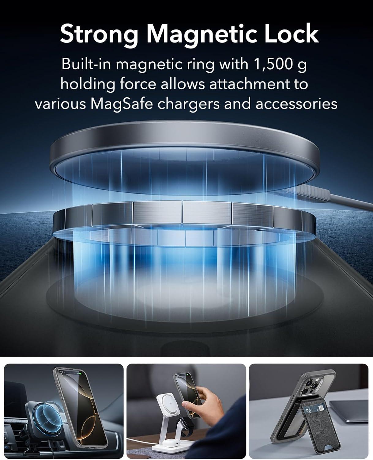Stronger Magnetic Lock: powerful ring of magnets with 1,500 g of holding force enables faster, easier place-and-go wireless charging and a secure lock on any MagSafe accessory