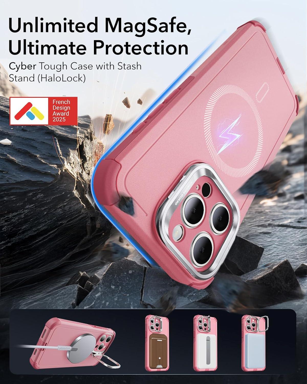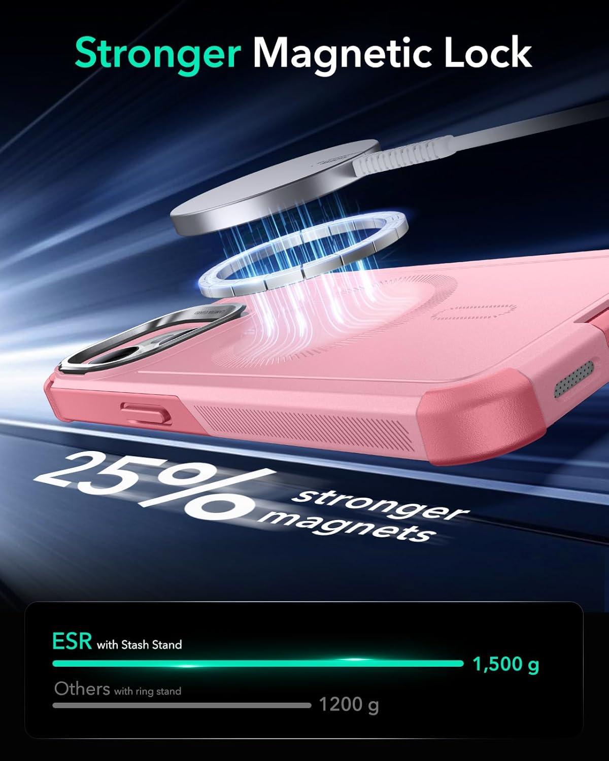 ESR for iPhone 17 Pro Max Case with Stash Stand, 7X Military-Grade Drop Protection with Camera Control, Shock-Absorbing Phone Rugged Cover, Compatible with MagSafe Accessories, Cyber Series, Black(Magnetic Stand-Pink)