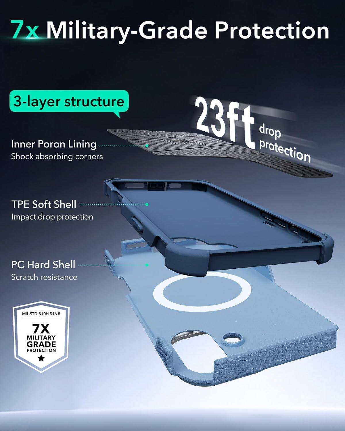 Military-Grade Protection: rigorously tested to ensure 7x total protection on all sides, 3-layer structure with a hard TPE and PC outer shell resists impacts and scratches, while the soft inner shell absorbs shocks, protecting against drops up to 23 ft