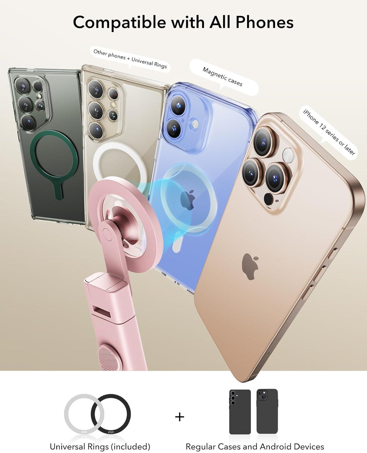 Compatible with All Phone Models: supports iPhone MagSafe and includes 2 metal rings; this cell phone stand is compatible with iPhone 17/16/16e/15/14/13/12 series and MagSafe-compatible phone cases; also compatible with non-MagSafe phones and non-MagSafe phone cases using the included magnetic rings, such as iPhone 11/X/8 series, Samsung Galaxy S25/S24/S23/S22/S21 series, and Google Pixel phones and more.