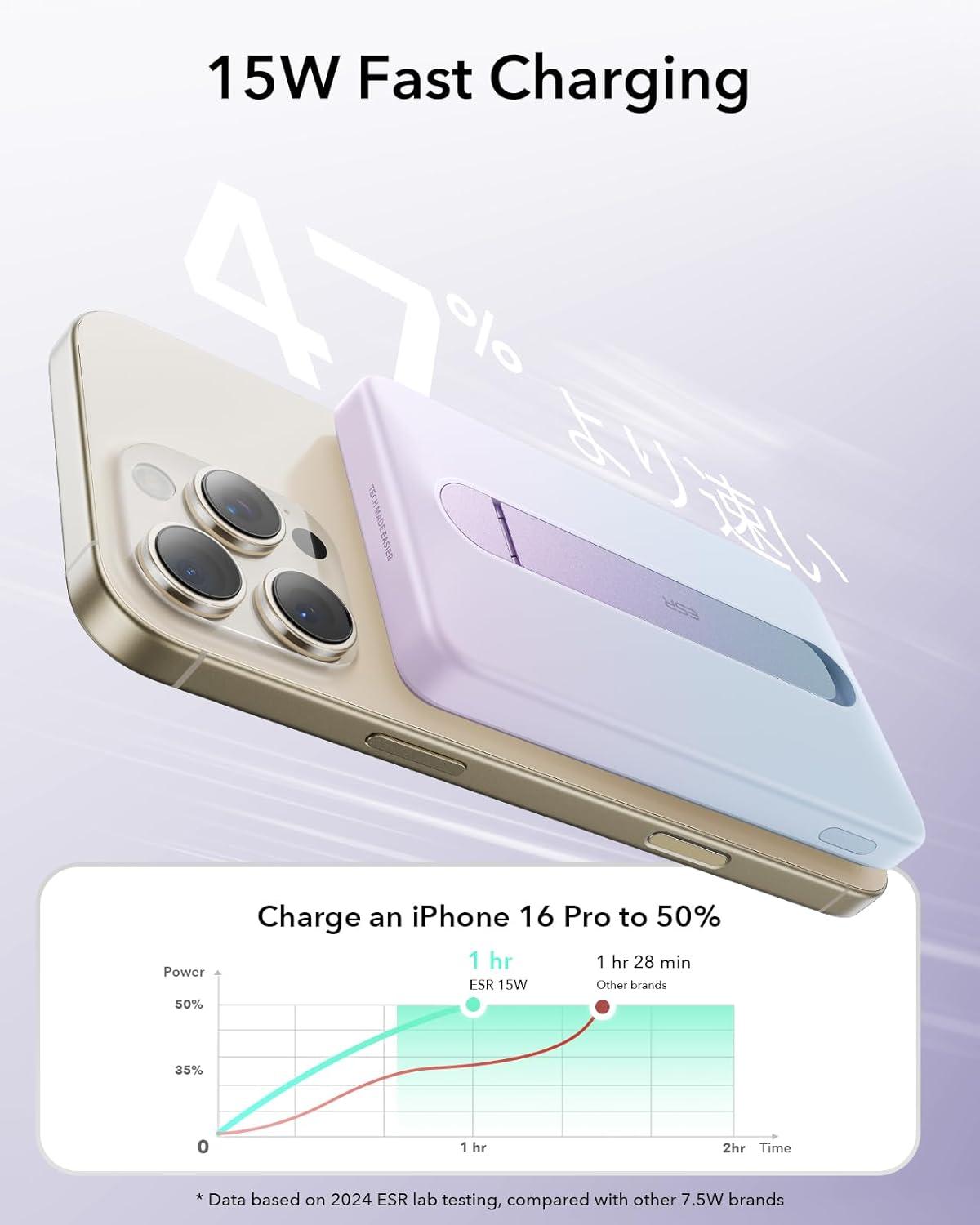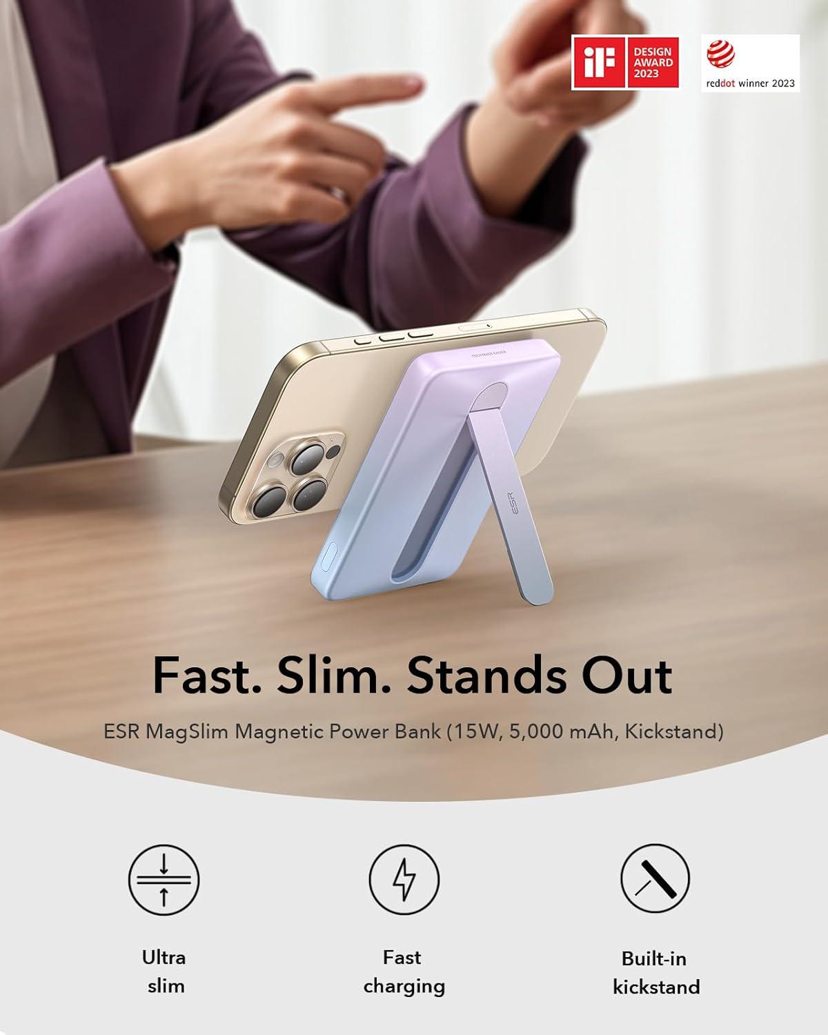 ESR for MagSafe Power Bank, Kickstand 5,000mAh MagSafe Portable Charger 0.6 in,15W Ultra-Fast Battery Pack, 20W USB-C MagSlim Charger with Cable for iPhone 17/16/15/14/13/12, Sky Blue(15W Stand 5000mAh-Pastel)