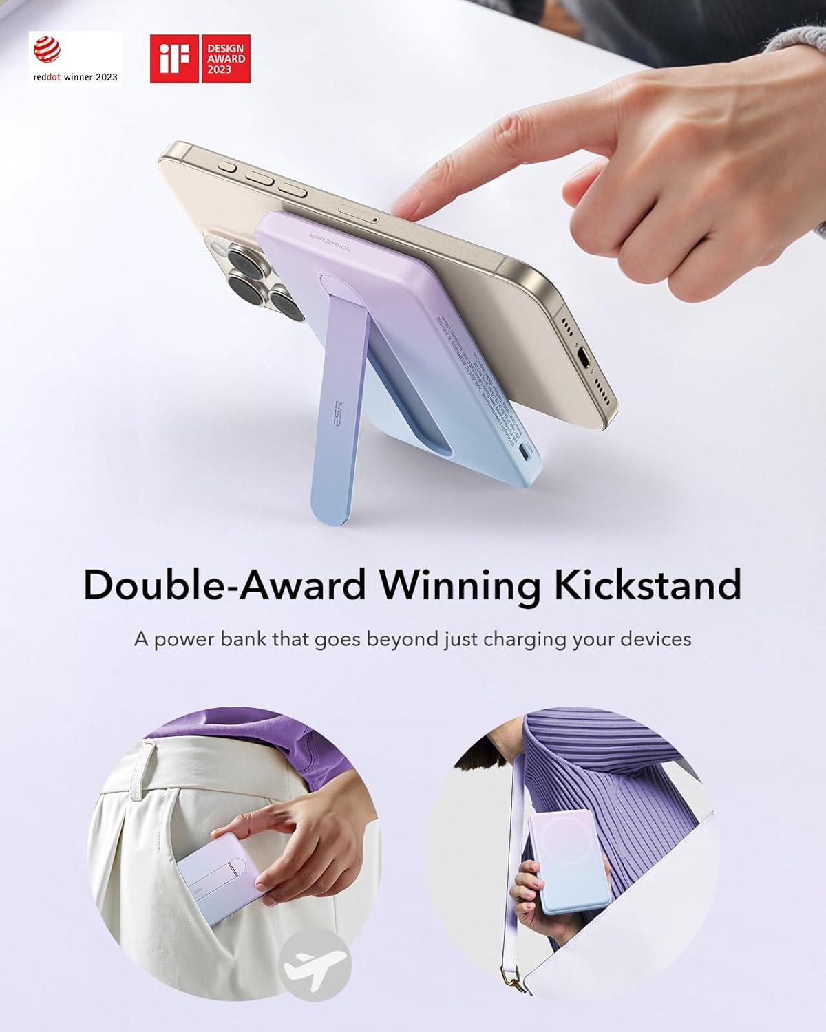 Ultra-Compact and Double Award-Winning Design: slim and compact at just 0.60 in thick and 0.33 lb, this 5,000mAh magsafe portable charger, an IF and Red Dot Award winner, features an innovative kickstand design with adjustable angles between 45° and 70°, ensuring perfect viewing angles for watching or browsing