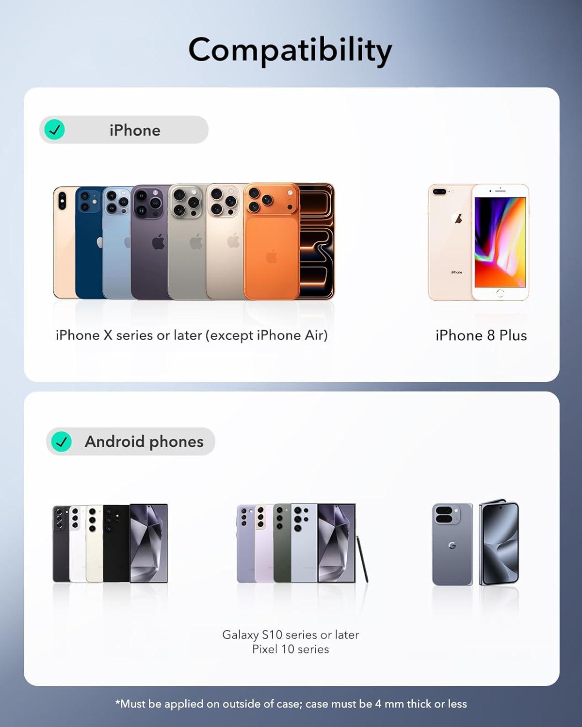 Compatibility: compatible with iPhone 17/16/16e/15/14/13/12 series, Samsung Galaxy S24/S23/S22 series, Google Pixel 10 series and more; see Product Description below for a full list of compatible models; once installed the ring can be removed but not repositioned