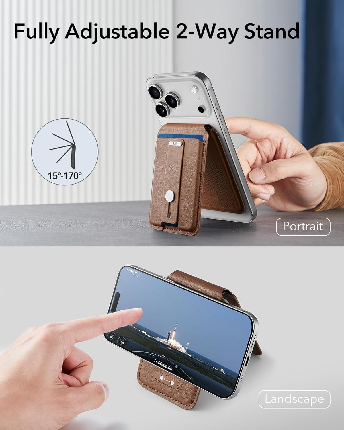 ESR Geo for Magsafe Wallet with Full Find My Functionality, 3 Card-Holder RFID Blocking, Magnetic Wallet for iPhone 17/16/15/14/13/12 Series, Adjustable Stand, Dark Black | Wallet Tracker, Adjustable Stand(A-Stand & Grip: Brown)