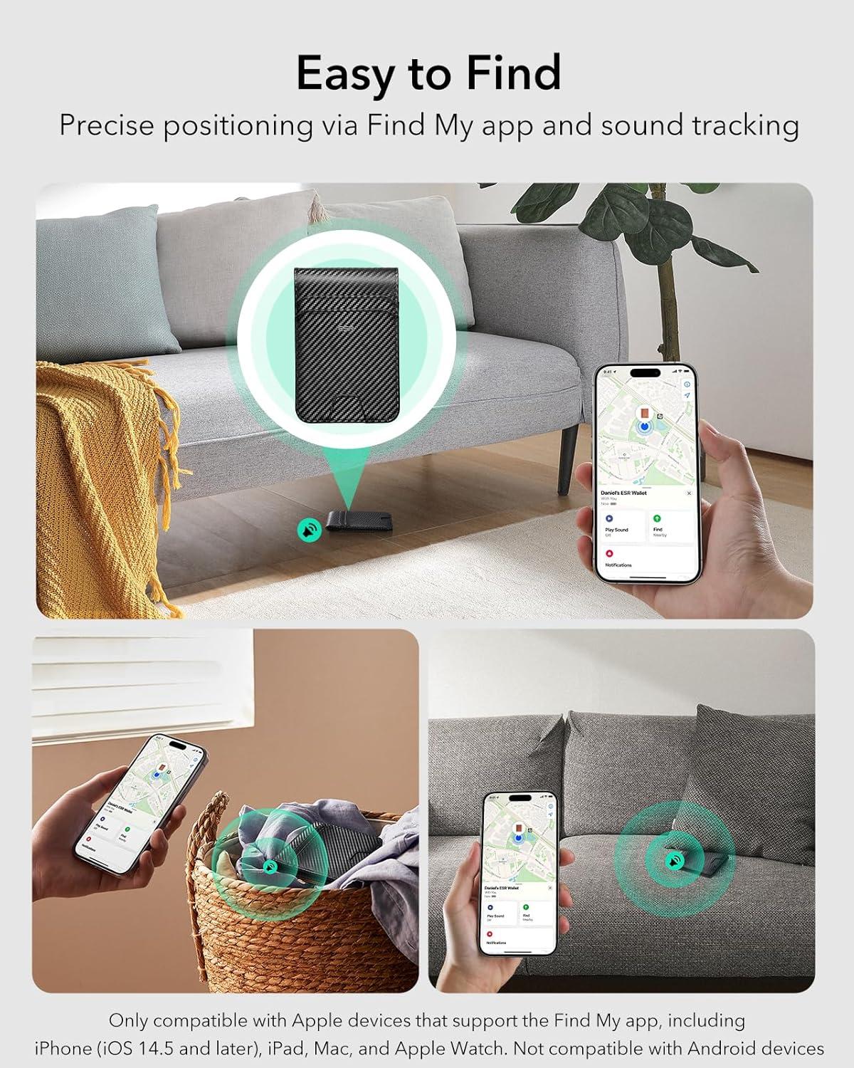 Works with Apple Find My: ESR Geo Wallet wiith Apple-certified Find My functionality(iOS 14.5 Above Only), just like an AirTag. Track its real-time location, play a sound, and get left-behind notifications