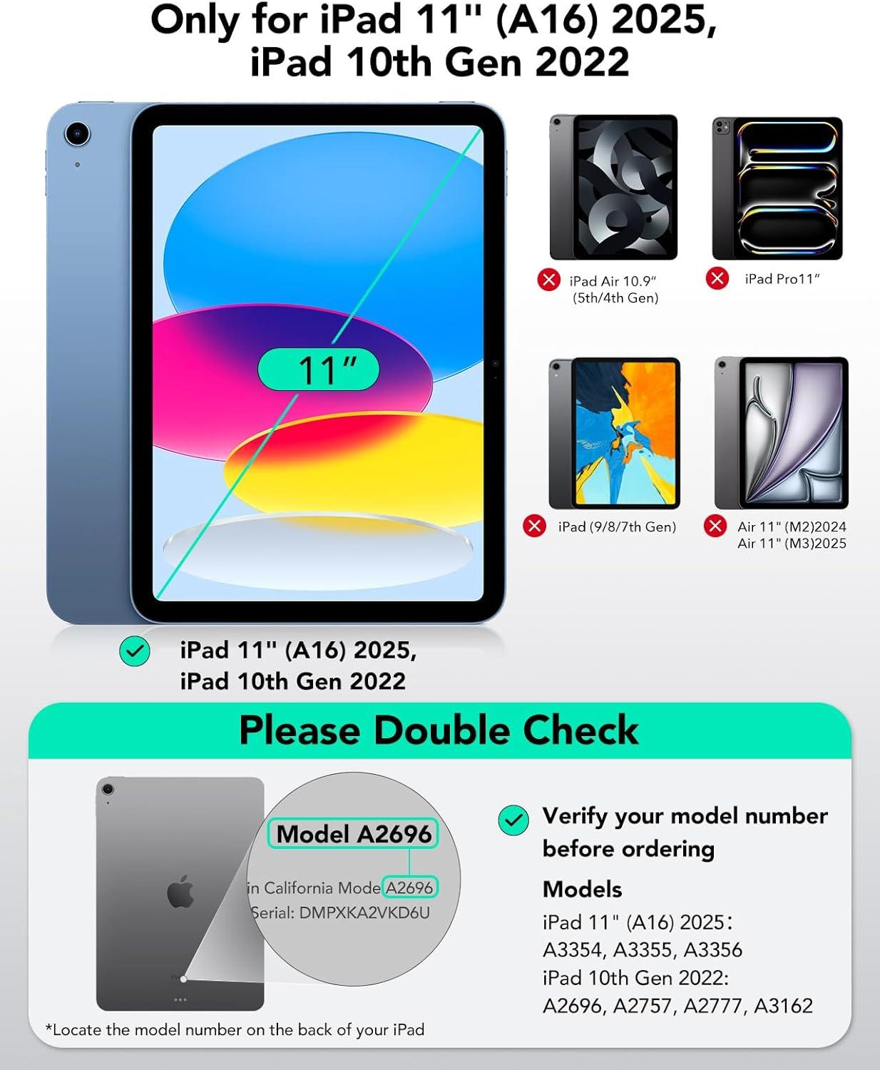 Compatibility: only compatible with iPad 11th(A16,2025)/10th Generation; models A3354、A3355、A3356、A2696、A2757、A2777、A3162