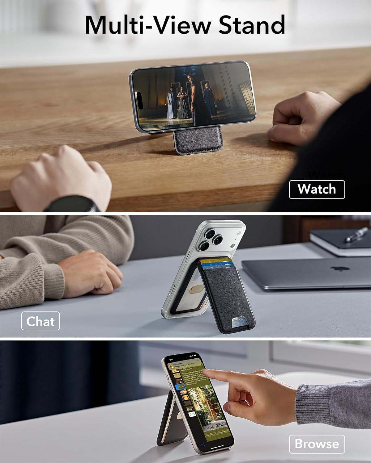 ESR Magnetic Wallet, Compatible with MagSafe Wallet with Adjustable Stand, for iPhone 17/16/15/14/13/12 Series, Not for iPhone 13/12 mini, 3 Card Holder, Vegan Leather, Black(A-3 Cards & Stand: Black)