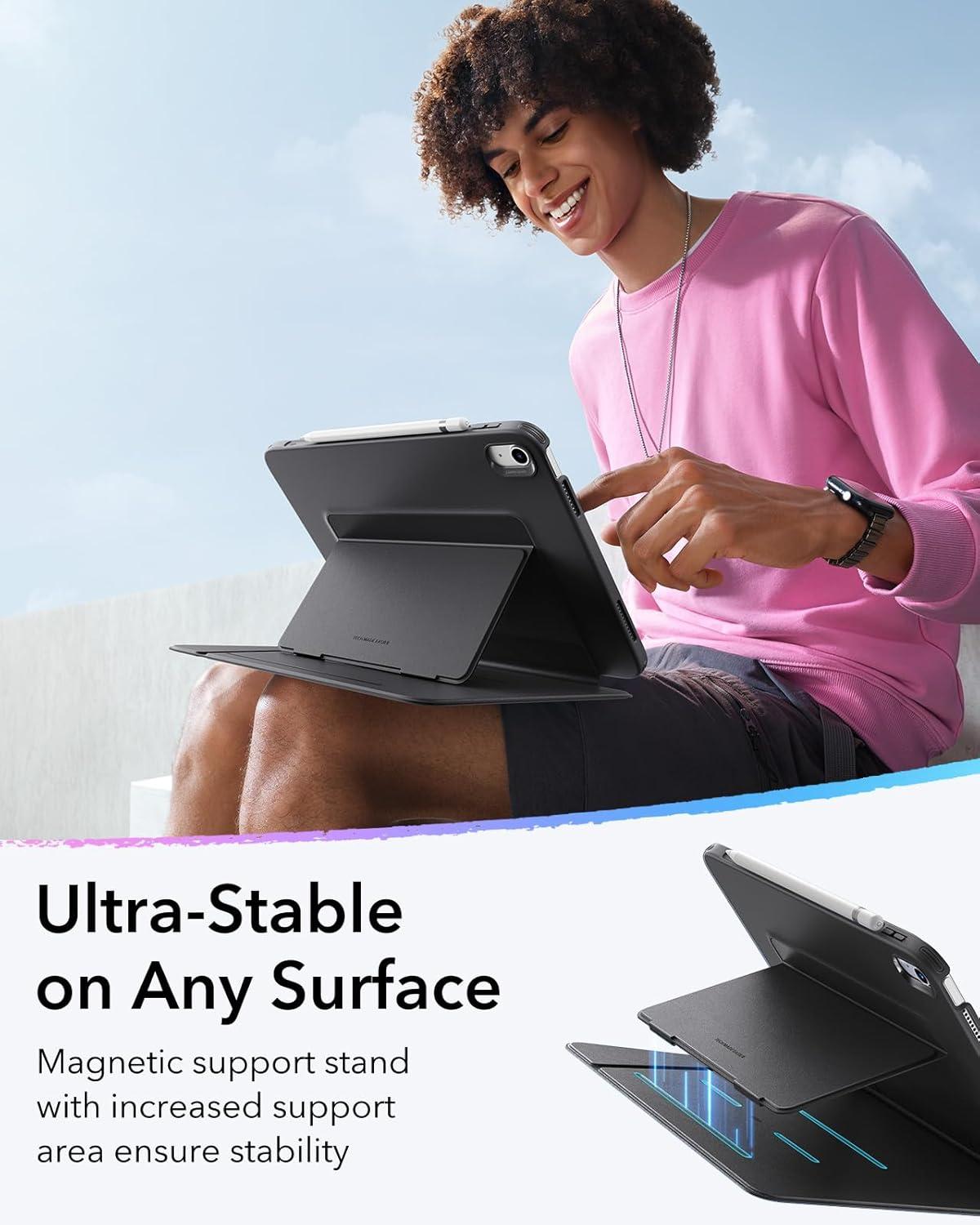 Ultra-Stable Stand: designed with a wide cover and strong magnetic bracket, this case is stable on any surface, whether a sofa, bed, hands, or even on your lap, ensuring it remains upright without slipping