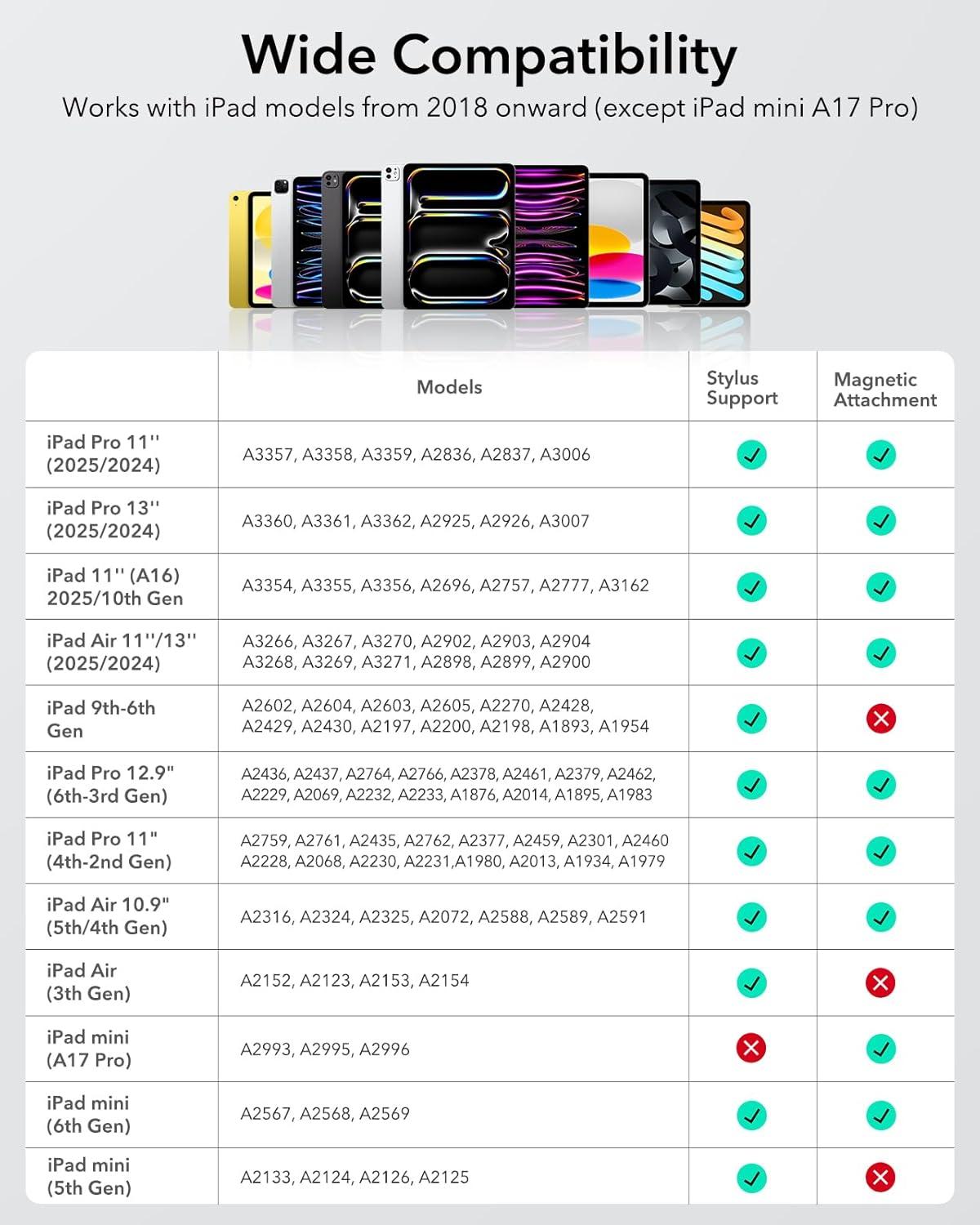 Compatibility: Compatible with iPads released in 2018 or later running iOS 12.2 and above, NEW 2025 iPad 11th(A16) & 10th(Writing & Magnetic Attachment) , iPad Air 11-inch & 13-inch (M2/M3), iPad Pro 11-inch & 13-inch (M5/M4), iPad 9/8/7/6 Gen, iPad Air 11/13(M2/M3),iPad Air 3/4/5 Gen, iPad Pro 11 inch 1/2/3/4 Gen, iPad Pro 12.9 inch 3/4/5/6 Gen, iPad Mini 5/6 Gen; Not compatible with other iPad models, iPhone, Android, Microsoft, or any other device.